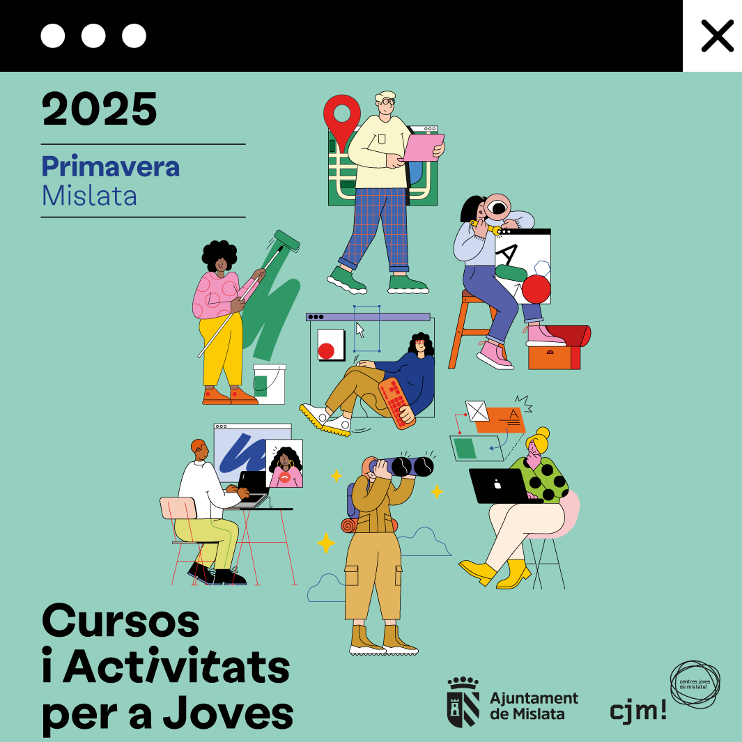 Inscripció: fins al començament de l’activitat. La inscripció pots fer-la per internet o als Centres Joves. Els cursos es realitzaran si hi ha almenys 10 persones inscrites. Els cursos i tallers s’adrecen, preferentment, a joves residents a Mislata de 12 a 30 anys (excepte als cursos i tallers que especifiquen edats concretes, els més joves -12 a 16 anys- i els que formen part del programa eines, per a majors de 16 anys).