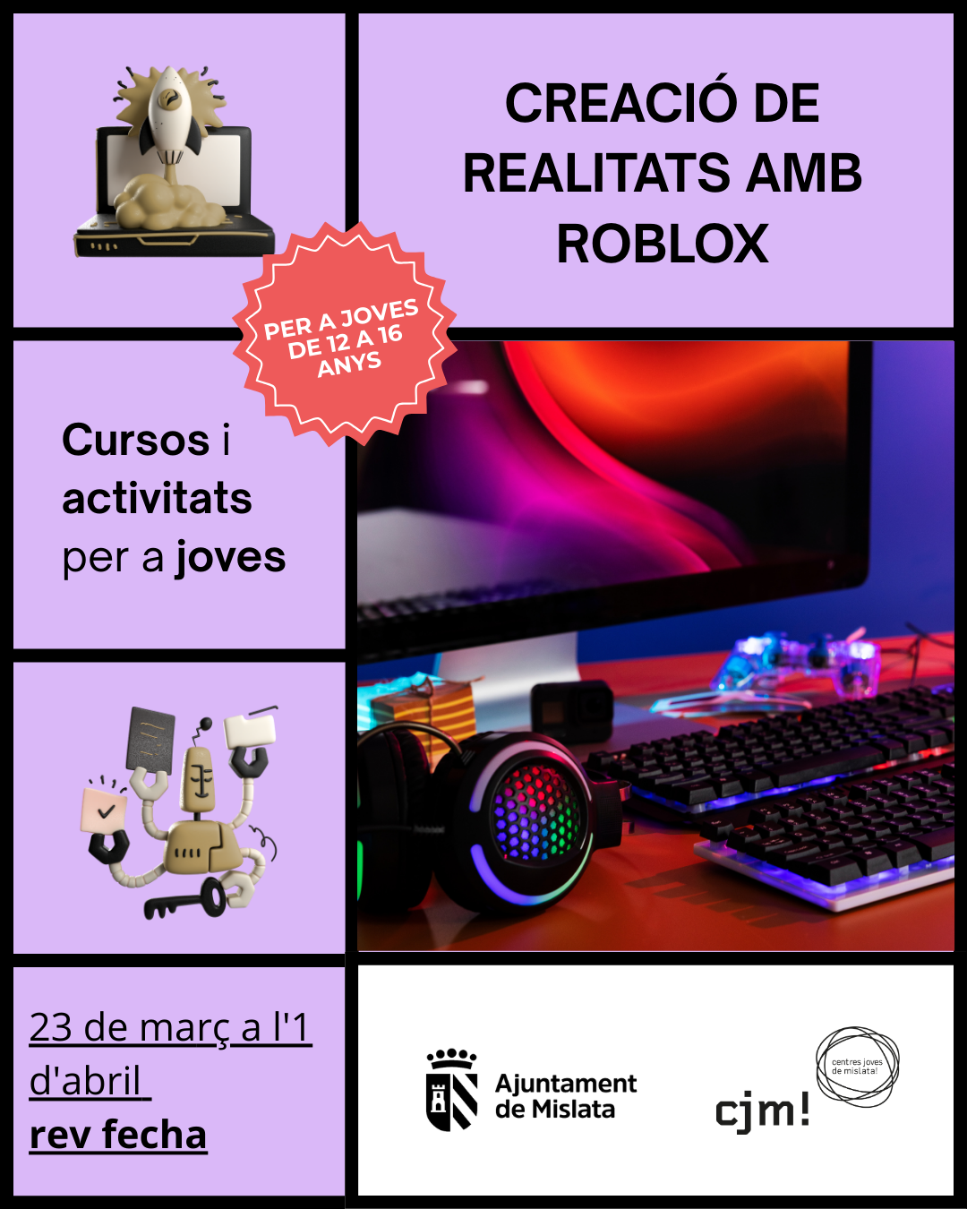 Vols aprendre a programar i construir el teu propi joc en Roblox? Ací podràs familiaritzar-te amb la plataforma Roblox i Roblox Studio, fent-ús del llenguatge d’scripting Lua, dissenyant els teus propis mons, escenaris i personatges, i programant controls de moviments, animacions, sistemes de puntuació, entre d’altres.
