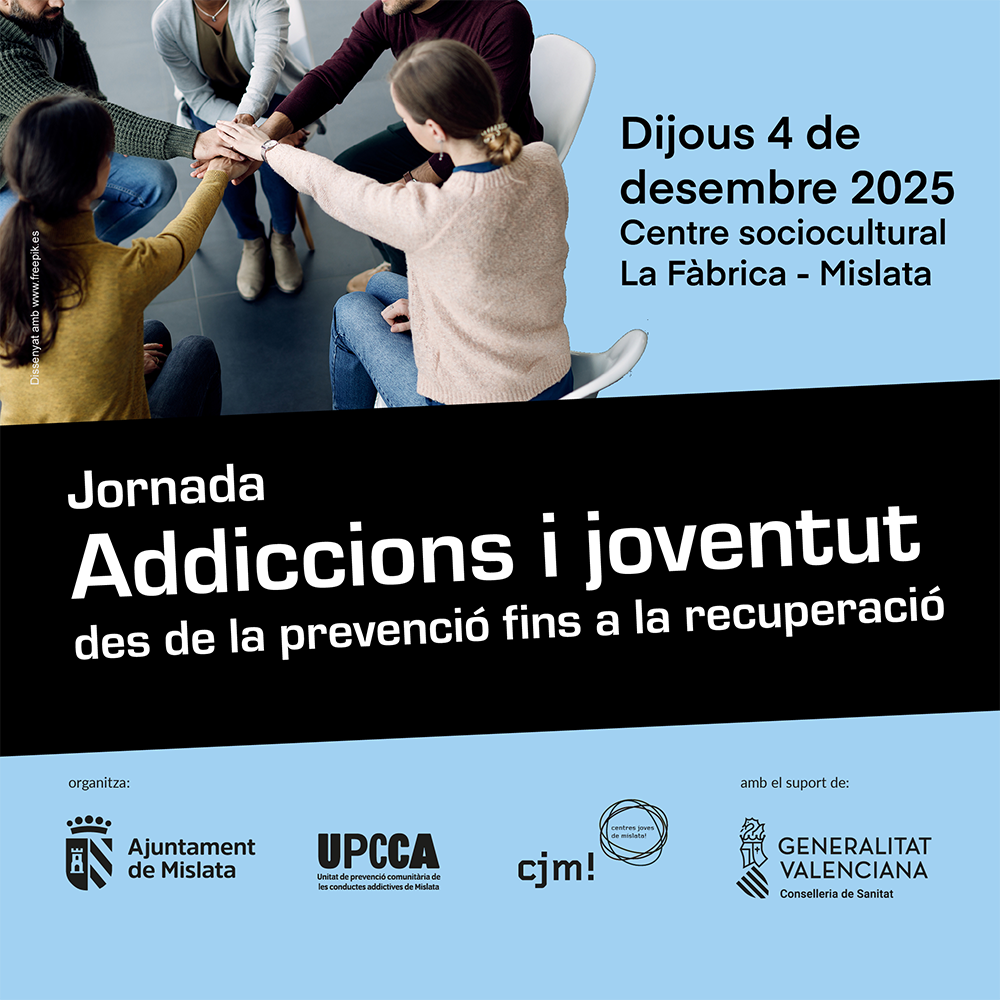 El pròxim dijous 4 de desembre a partir de les 9 h i fins a les 13.30h en el Centre Sociocultural La Fàbrica (C/ Felipe Bellver, 43), la Unitat de Prevenció Comunitària de Conductes Addictives (UPCCA) de l'Ajuntament de Mislata en col·laboració amb els Centres Joves de Mislata us conviden a la ‘’Jornada sobre addiccions i joventut: des de la prevenció fins a la recuperació’’.